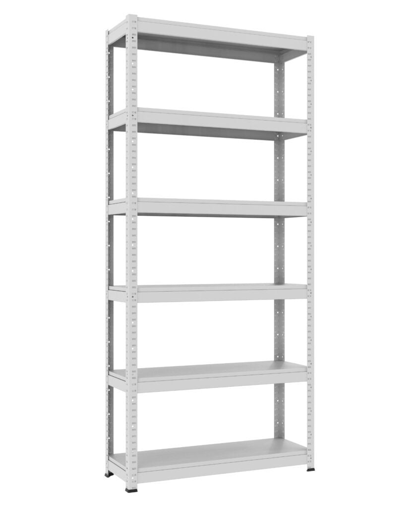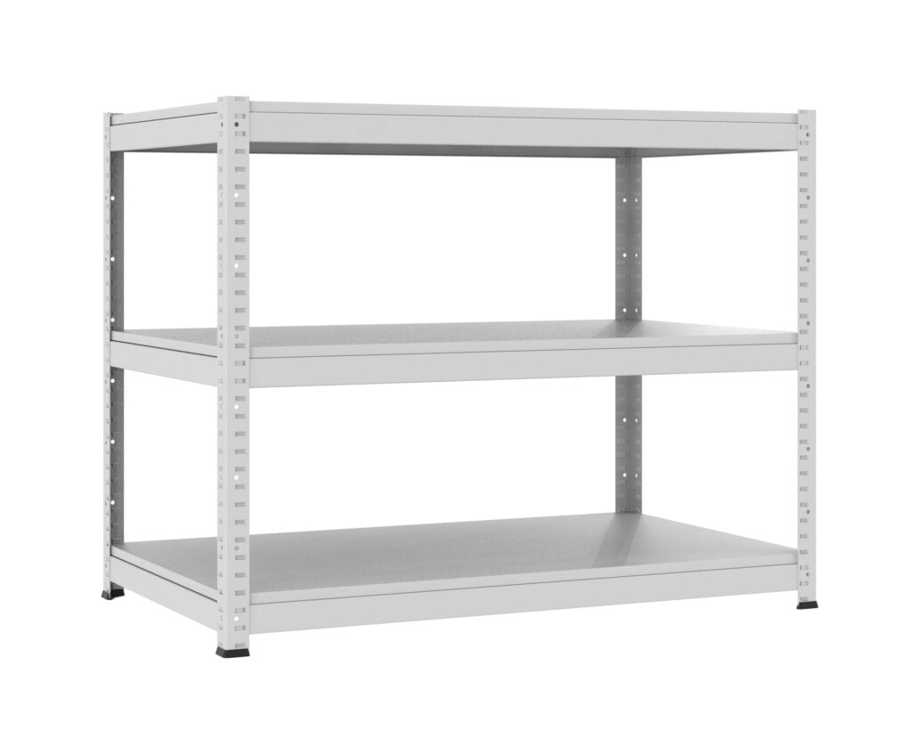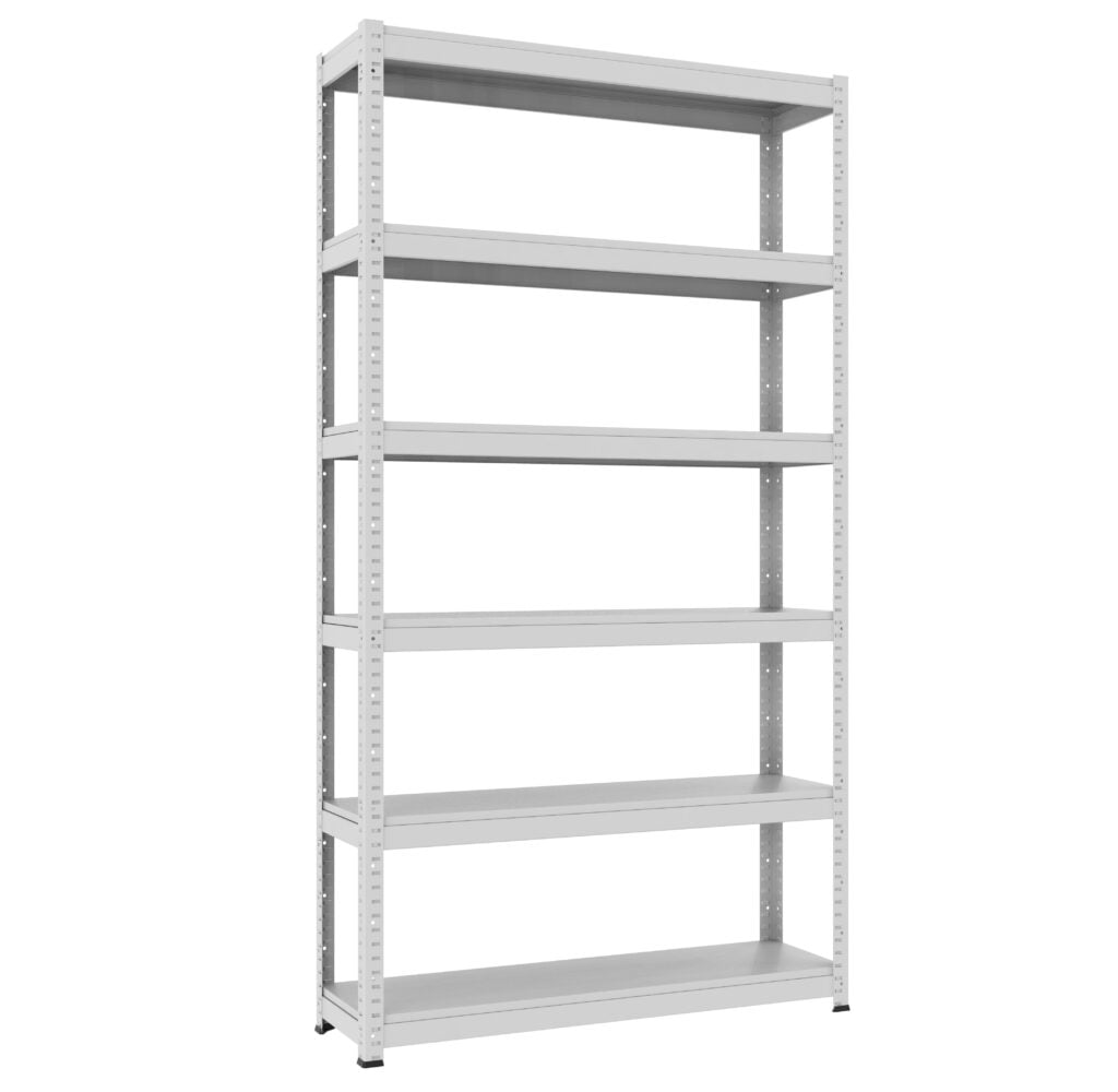 Regał magazynowy z metalowymi półkami. Elementy pionowe regału wykonane z blach o grubości ...