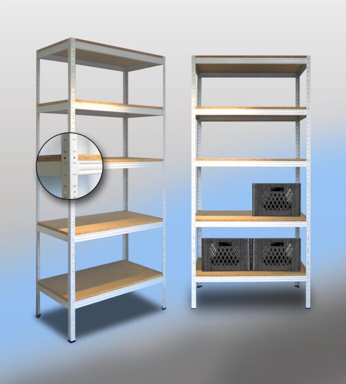 - Regał stalowy wtykowy z półkami z płyty wiórowej, przeznaczony do hurtowni, magazynów, archiwów i pomieszczeń gospodarczych.
