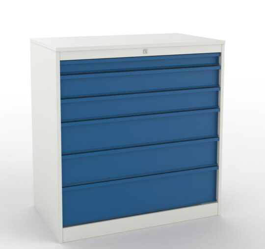 Szafki narzędziowe szufladowe zamykane są centralnym zamkiem z systemem zapobiegającym jednoczesnemu wysunięciu kilku szuflad.