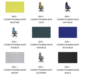 Ergonomiczny fotel Wau posiada też mechanizm ruchowy „slid”, a zagłówek, oparcie i siedzisko jest przewiewne dzięki tapicerowaniu siatką lub wykorzystaniu tworzywa o dużej sprężystości. Estetyczna podstawa z kółkami wykonana z polakierowanego aluminium powoduje, że fotel jest mobilny i znosi obciążenia do 130 kg.
